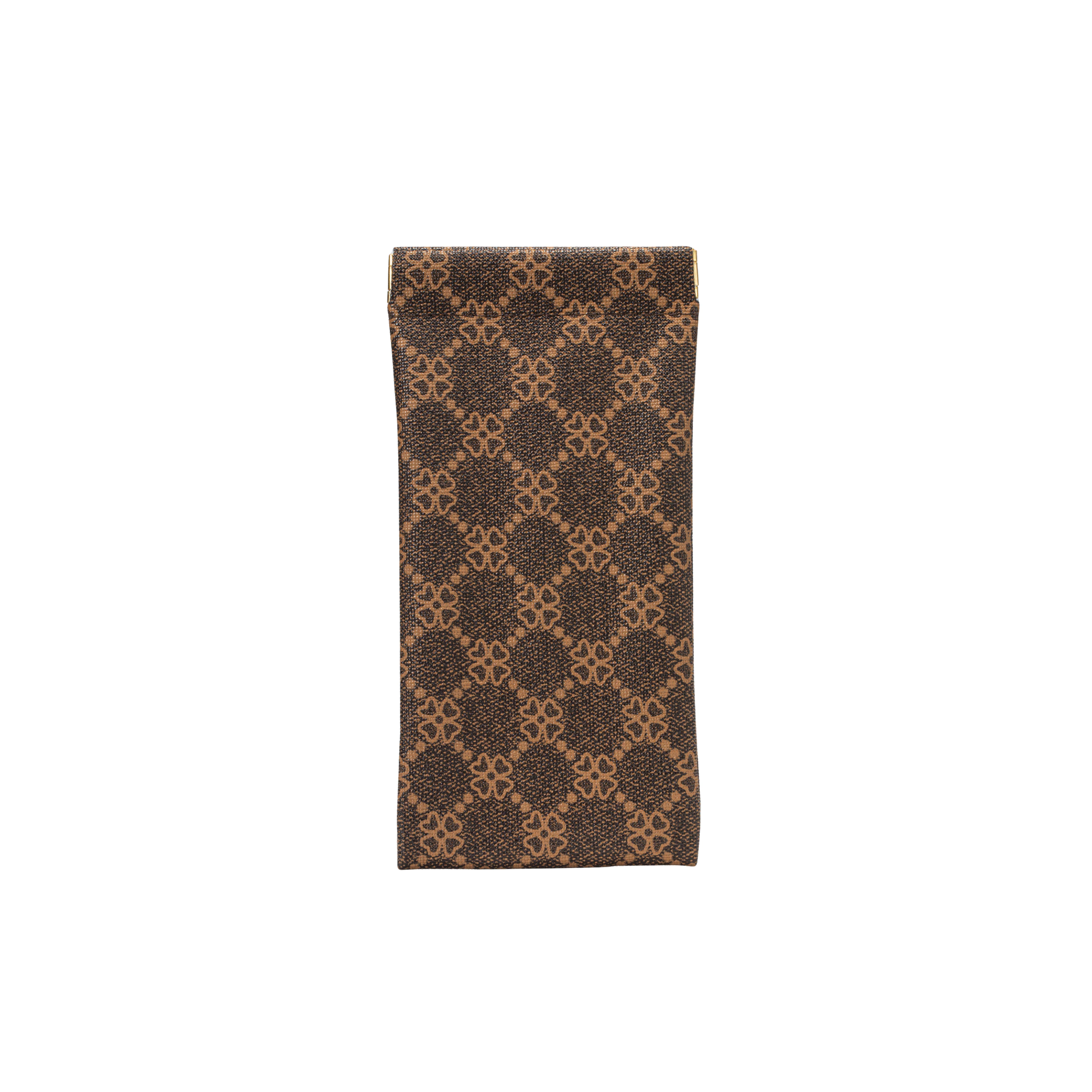 Featuring an elegant geometric pattern with dark brown diamonds and floral motifs, this textile pouch is closed with a subtle snap-button. It offers a unique and sophisticated way to protect your glasses, blending classic style with functionality.