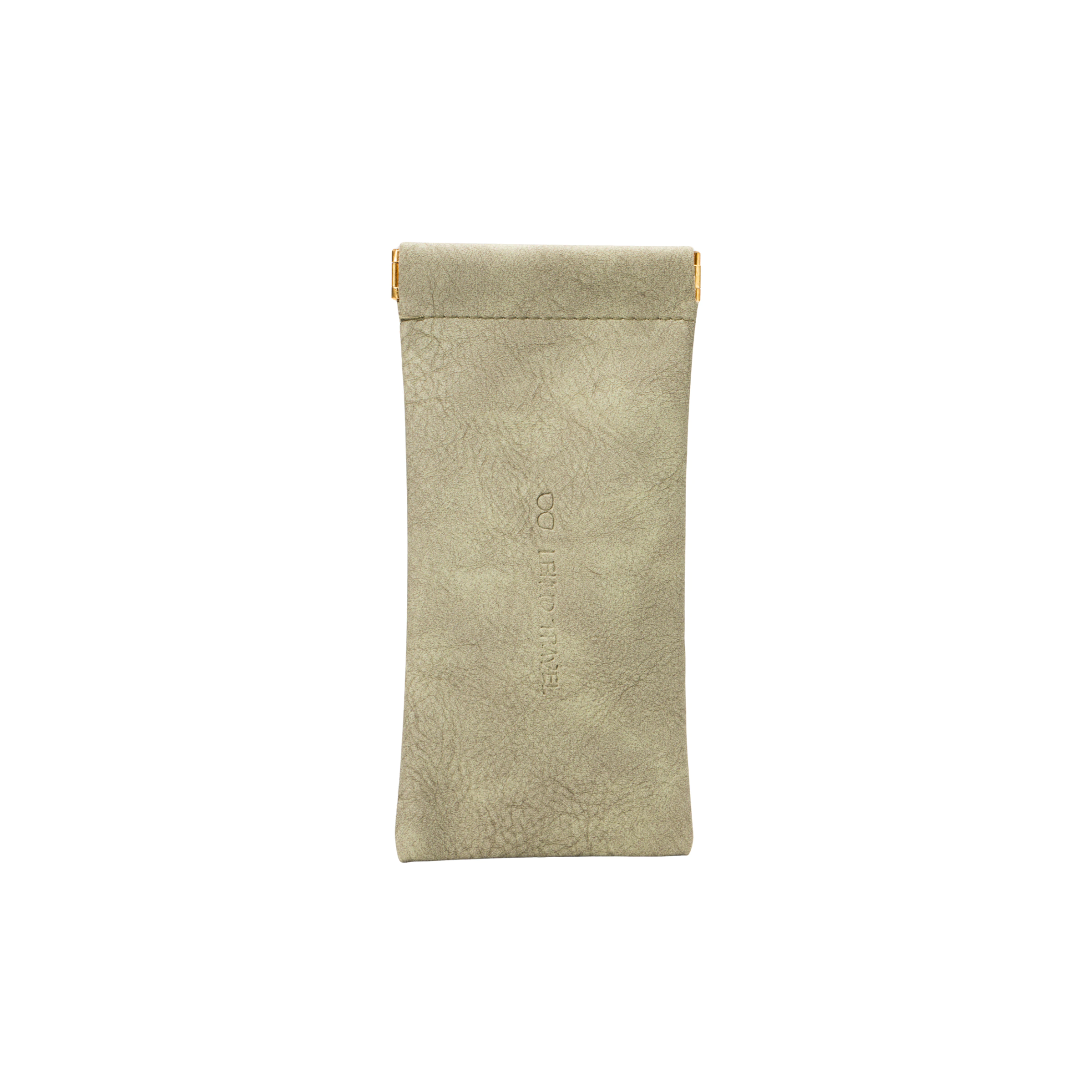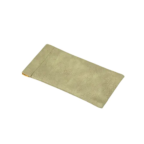 This olive-green suede pouch features a practical drawstring closure with metallic grommets. Its minimalist design and soft texture offer stylish, everyday protection for your eyewear, perfect for a casual yet refined look.