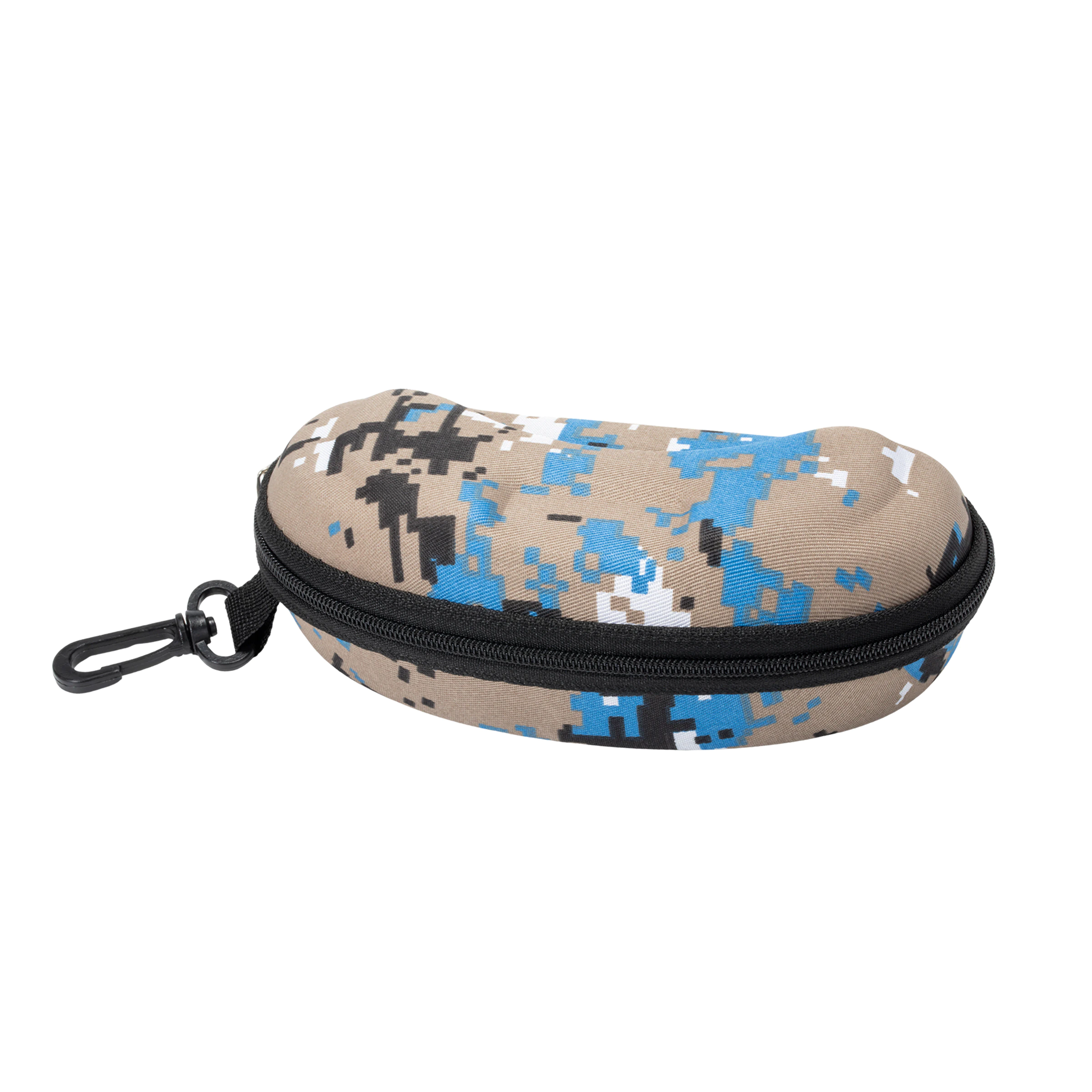 Featuring a unique beige, black, and blue digital camo pattern, this case offers a distinct style. With its sturdy zipper and convenient carabiner, it provides reliable, portable protection for your glasses on any casual or outdoor adventure.