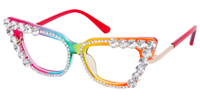 This eye-catching piece named, Vespera Cat-eye Multicolor Glasses presents a vibrant fabulous multicolored design with eye cat-eye-shaped frame. The frame edges are embedded with crystal diamonds that add a glamorous sparkly touch to your overall look. The Vespera eyeglasses design promotes retro-styled charm with a perfect blend of modern and sophisticated style. This chic eyepiece is a must-have accessory for fashion-forward ladies who are confident to make a bold fashion statement.