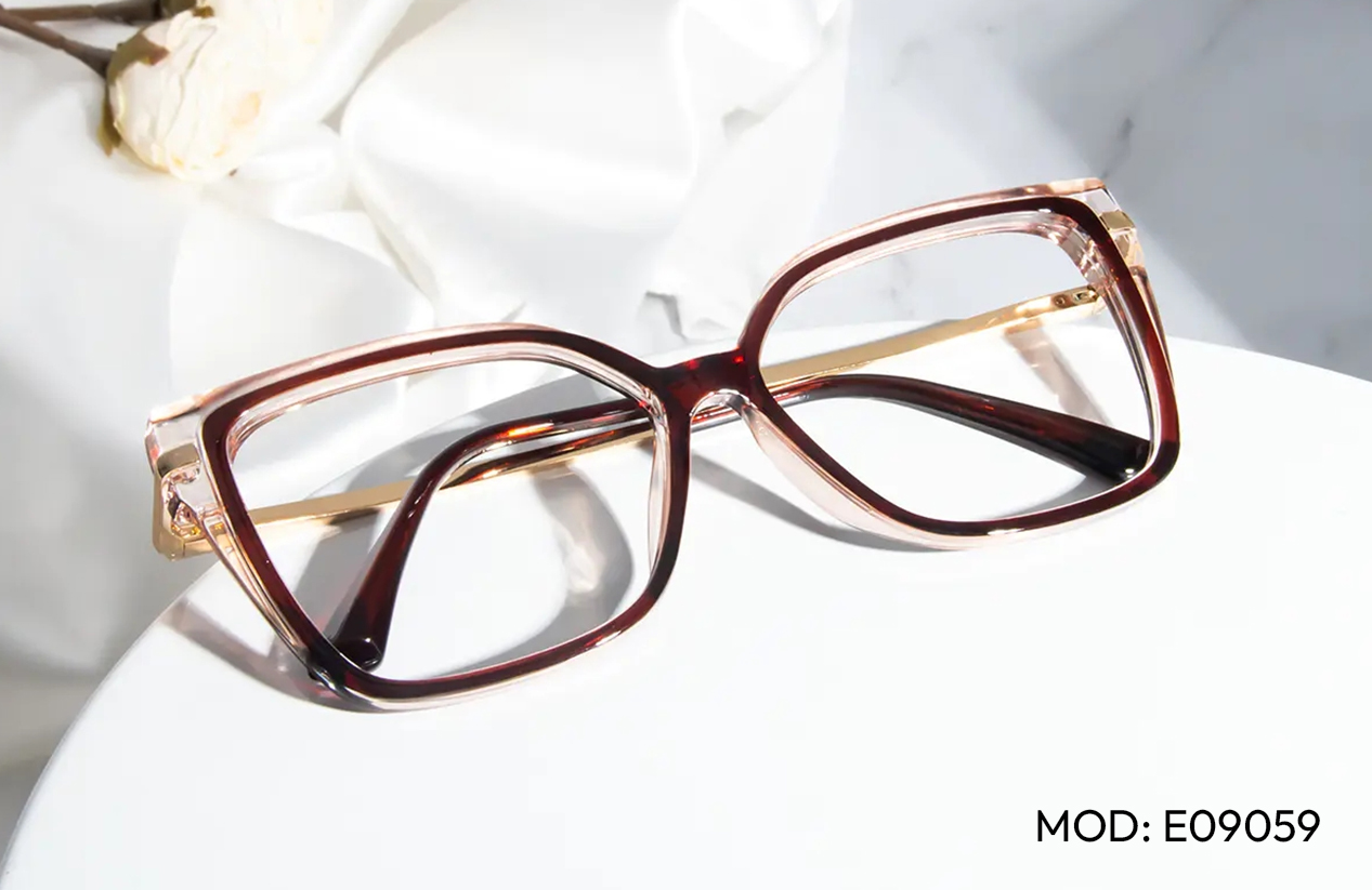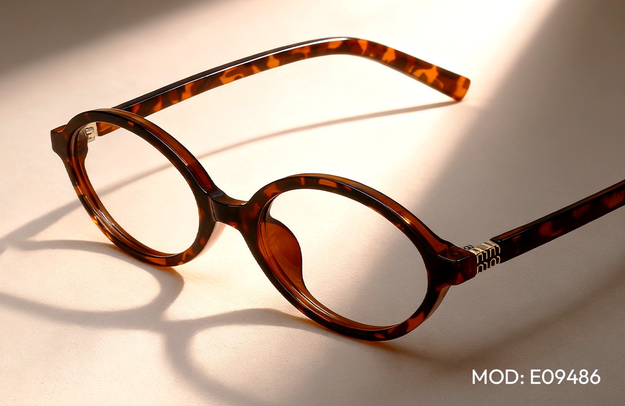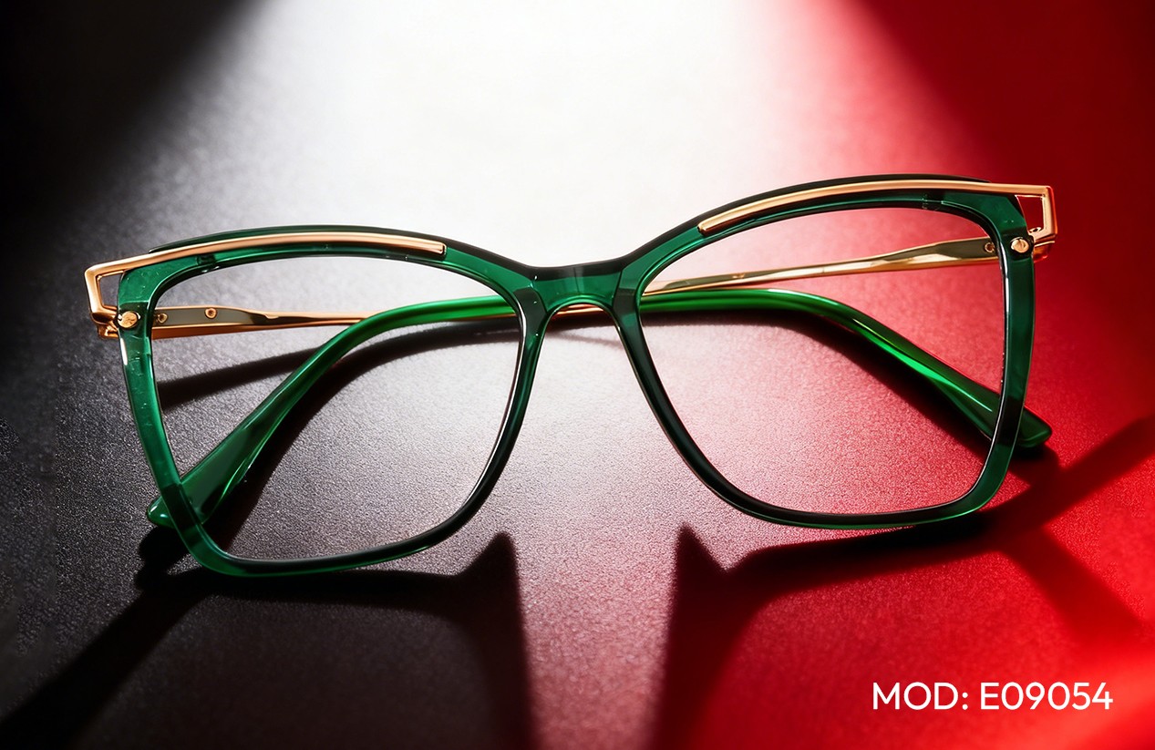 Green eyes are often linked to creativity, independence, and mystery. Because they sit opposite red and purple on the color wheel, frames in deep plum, amethyst, or rich Havana tones make green eyes appear brighter and more intense.