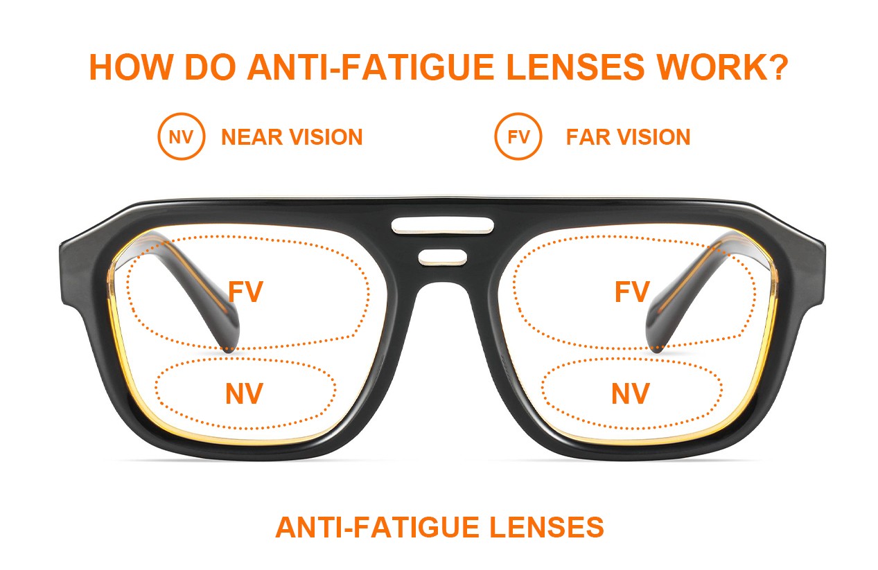Anti-fatigue lenses are engineered to reduce visual stress by incorporating a gentle power boost at the bottom of the lens. This subtle increase makes it easier to maintain focus during close-up activities such as typing, reading, or scrolling on a phone.