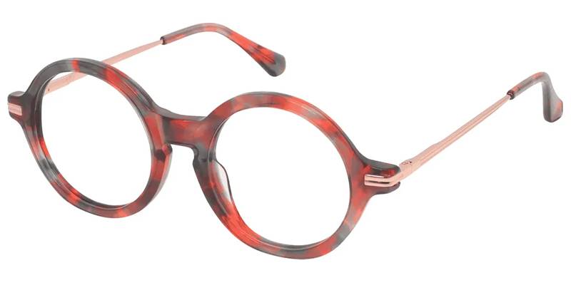 Glaucus's red tortoiseshell finish and golden spring hinges can make any outfit bloomed with personality. For ease of use, this round glasses features curved nose pads and lightweight spring hinges.