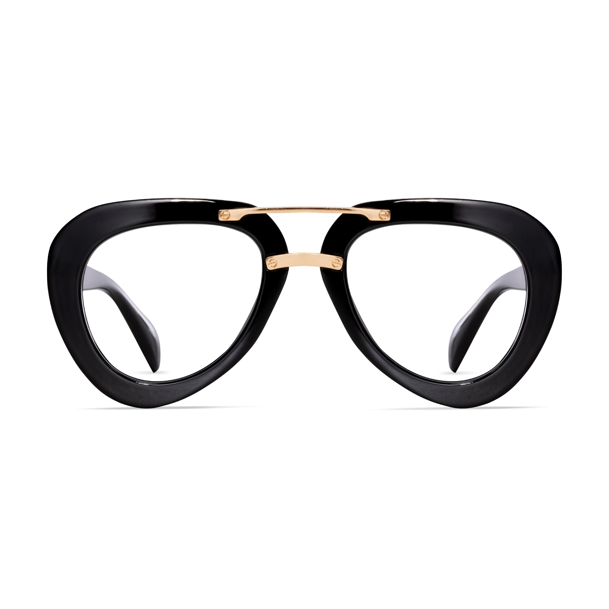 This bold geometric frame stands out with its thick black acetate and striking gold bridge. Its artistic shape brings a confident, fashion-forward attitude to any look.