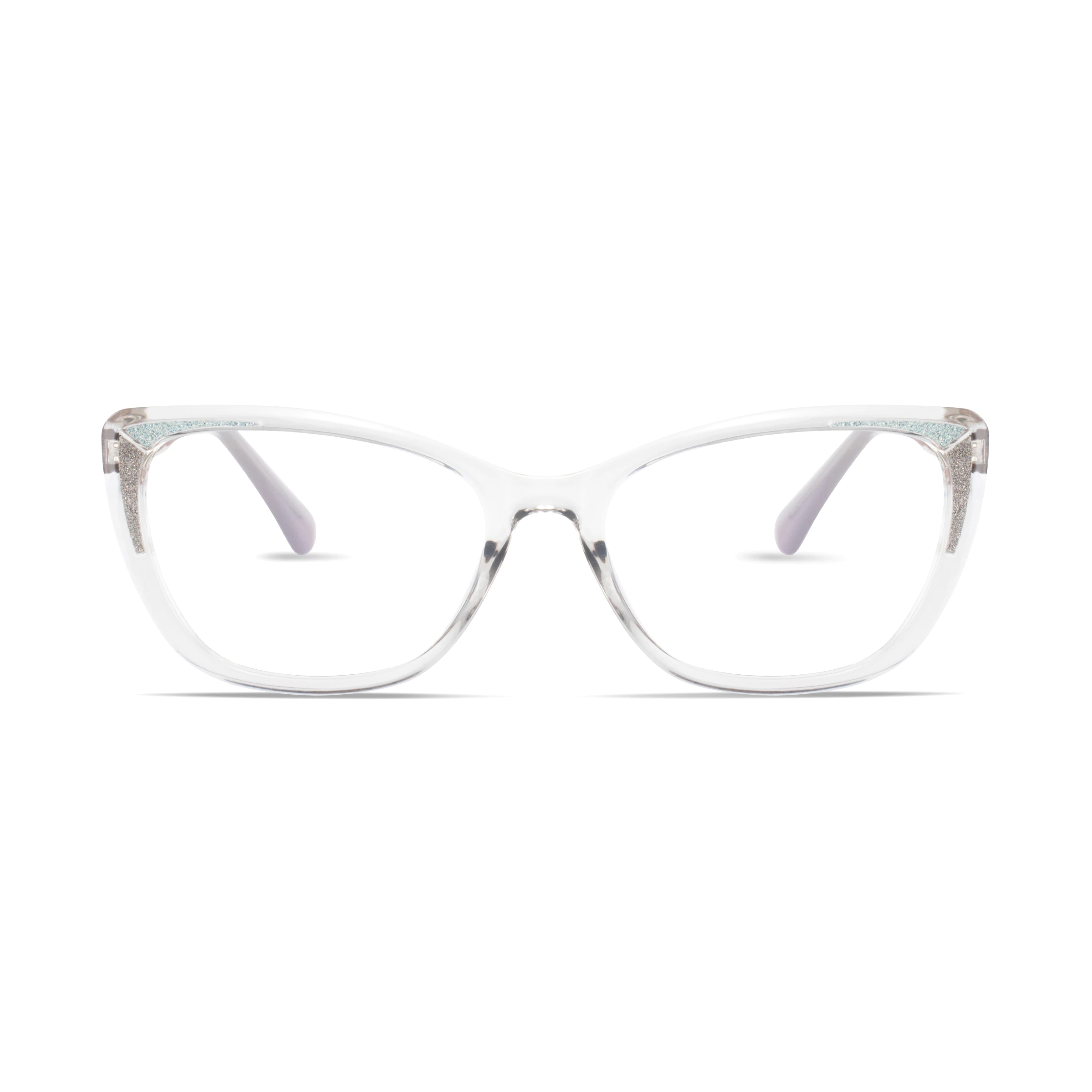 Crafted with a transparent frame and subtle glitter on the temples, these cat-eye glasses offer lightweight comfort and contemporary elegance. Perfect for stylish women, they add a chic, luminous touch to both professional settings and social occasions.