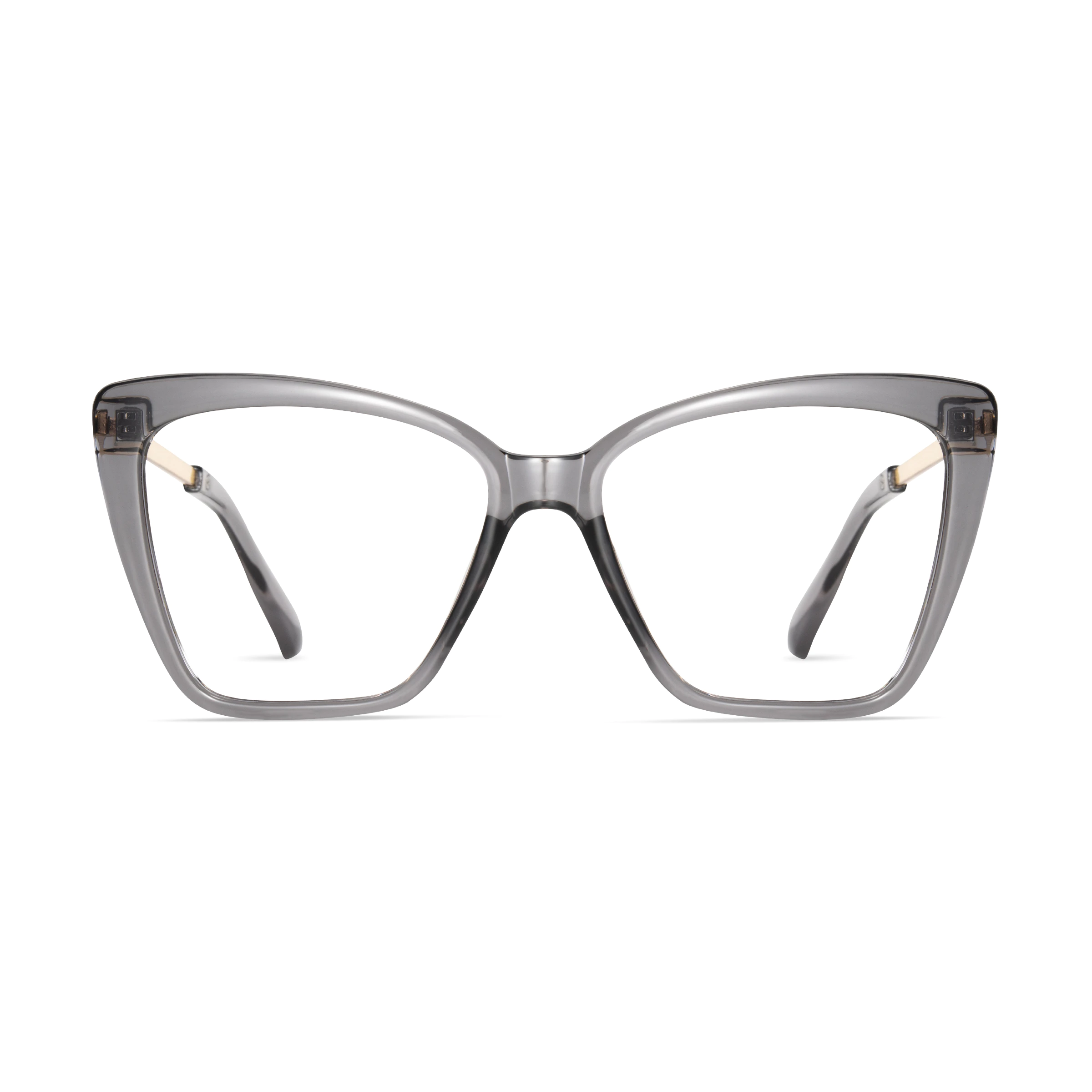 Crafted from lightweight transparent gray acetate with golden metal arms, these cat-eye glasses combine minimalism and modern elegance. Suitable for office or leisure, they enhance your style with subtle refinement and comfort.