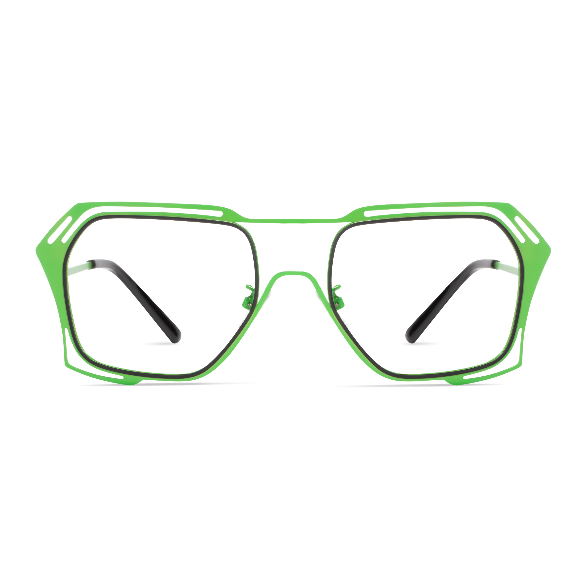 Vibrant green metal frames with black temples offer a bold geometric silhouette. The sturdy construction ensures lasting durability, perfect for creative workplaces or casual outings where a pop of color and modern style are desired.