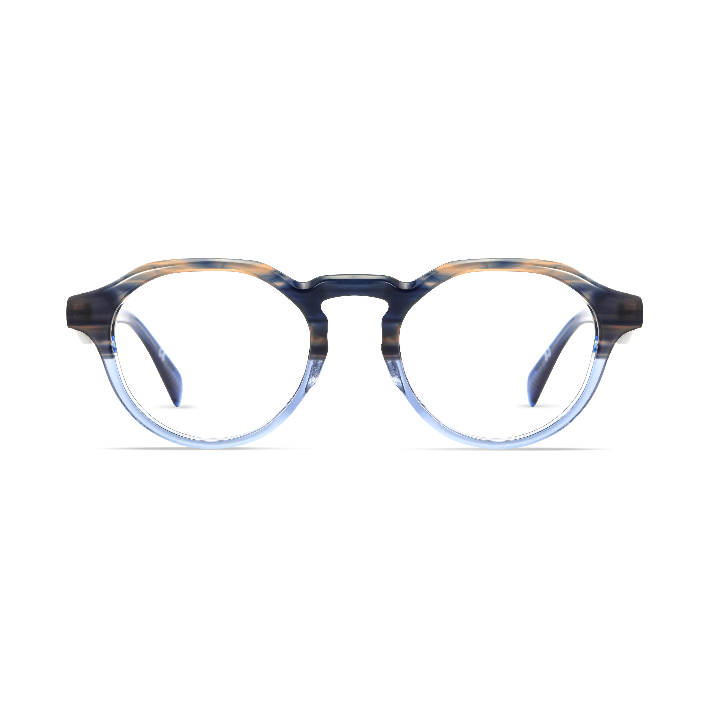 These contemporary eyeglasses feature a unique angular-rounded frame with a captivating color gradient. A translucent tortoiseshell front, blending deep brown and amber, seamlessly transitions into solid sky-blue temples. This sophisticated design offers a perfect balance of modern style and timeless elegance for any occasion.