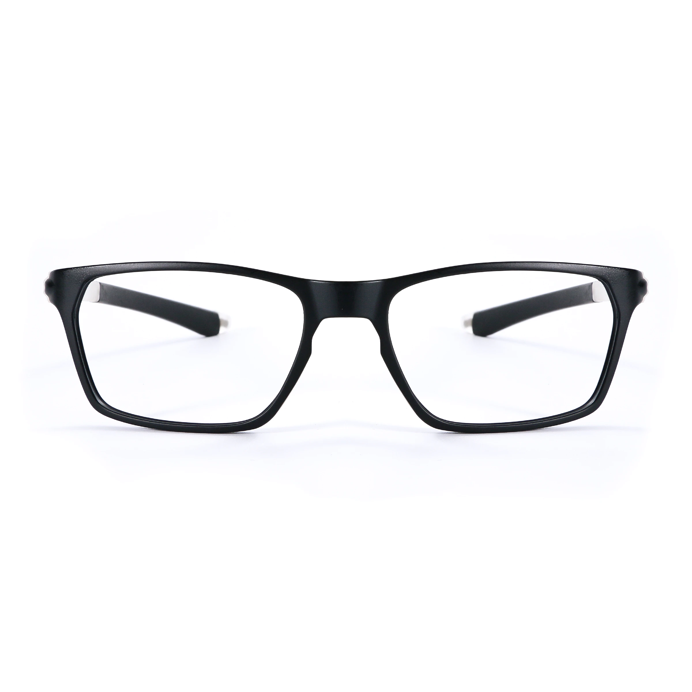 With a bold black and clear design, these TR90 sports glasses offer a dynamic blend of style and function. The full-rim rectangular frame is crafted for durability and comfort, ideal for both sports and daily wear.
