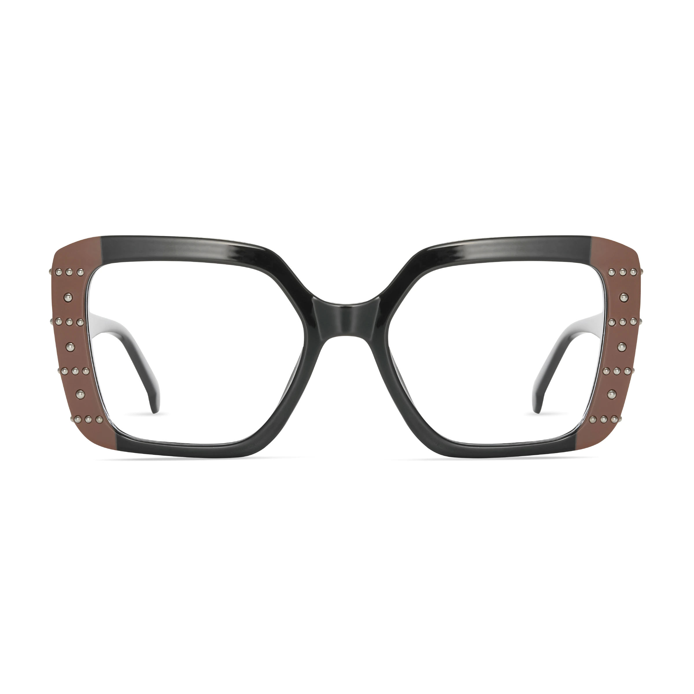 These oversized square eyeglasses feature a chic black and brown frame with shimmering stud details. The bold two-tone design blends modern flair with vintage appeal, making it a standout accessory for a confident, fashionable look.