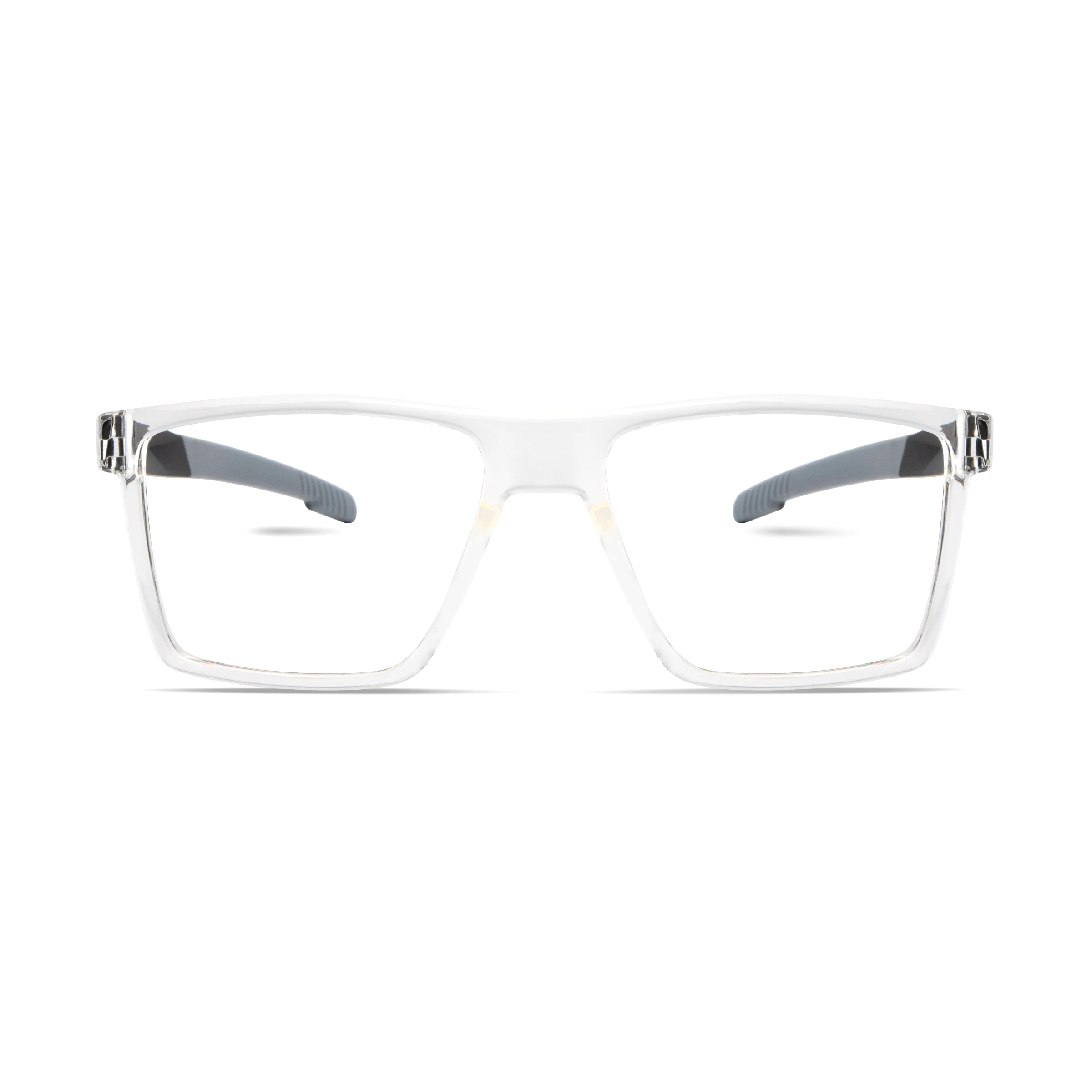 Clear acetate front with flexible TR-90 temples in black and grey, designed for lightness. These durable sports frames are ideal for gym workouts, running, and an energetic, comfortable lifestyle.