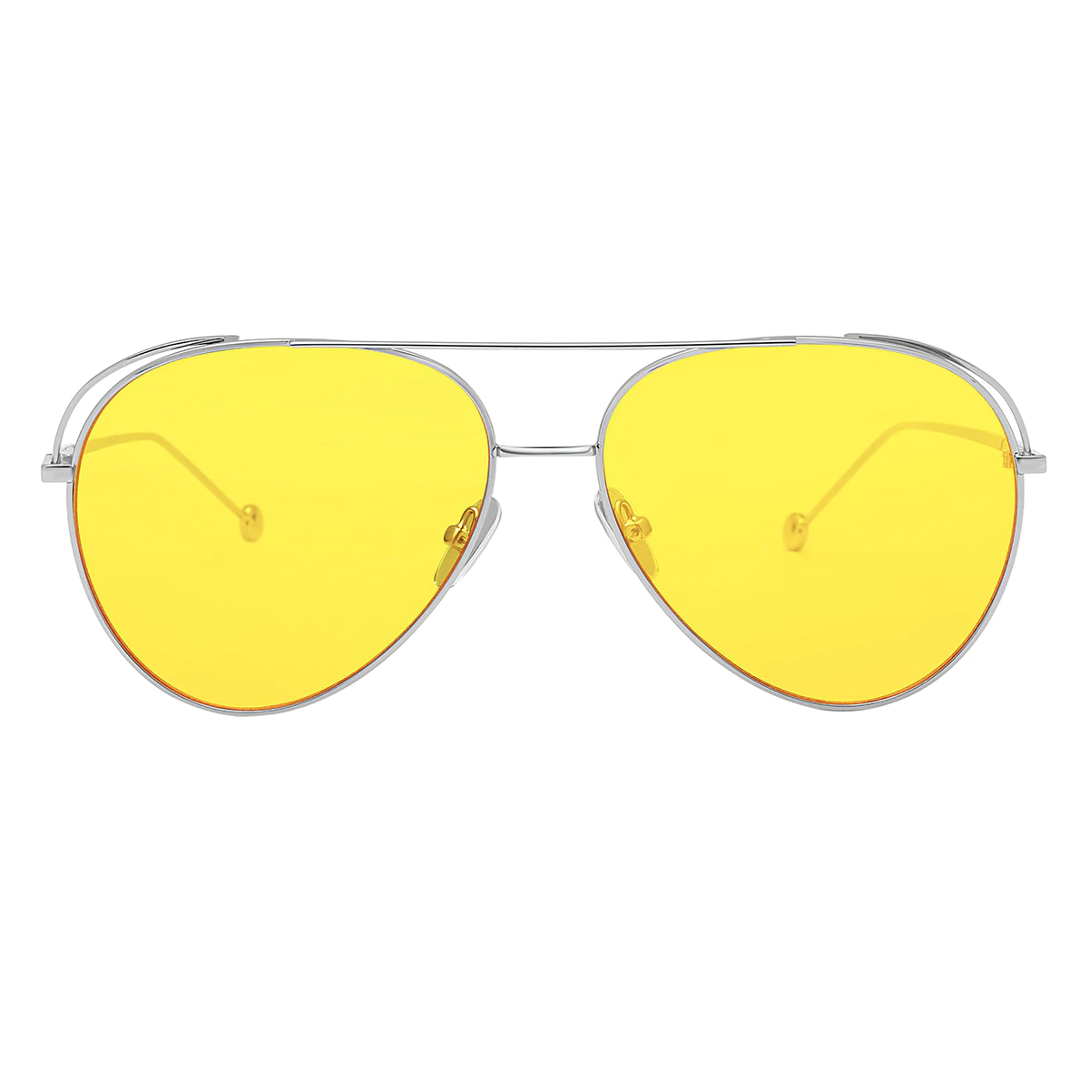 Add a vibrant twist to your look with our yellow aviator sunglasses. The bold yellow lenses make a playful statement while providing excellent sun protection. Made from durable metals, these full-rim frames offer a stylish fit, perfect for beach days or fun outings with friends.