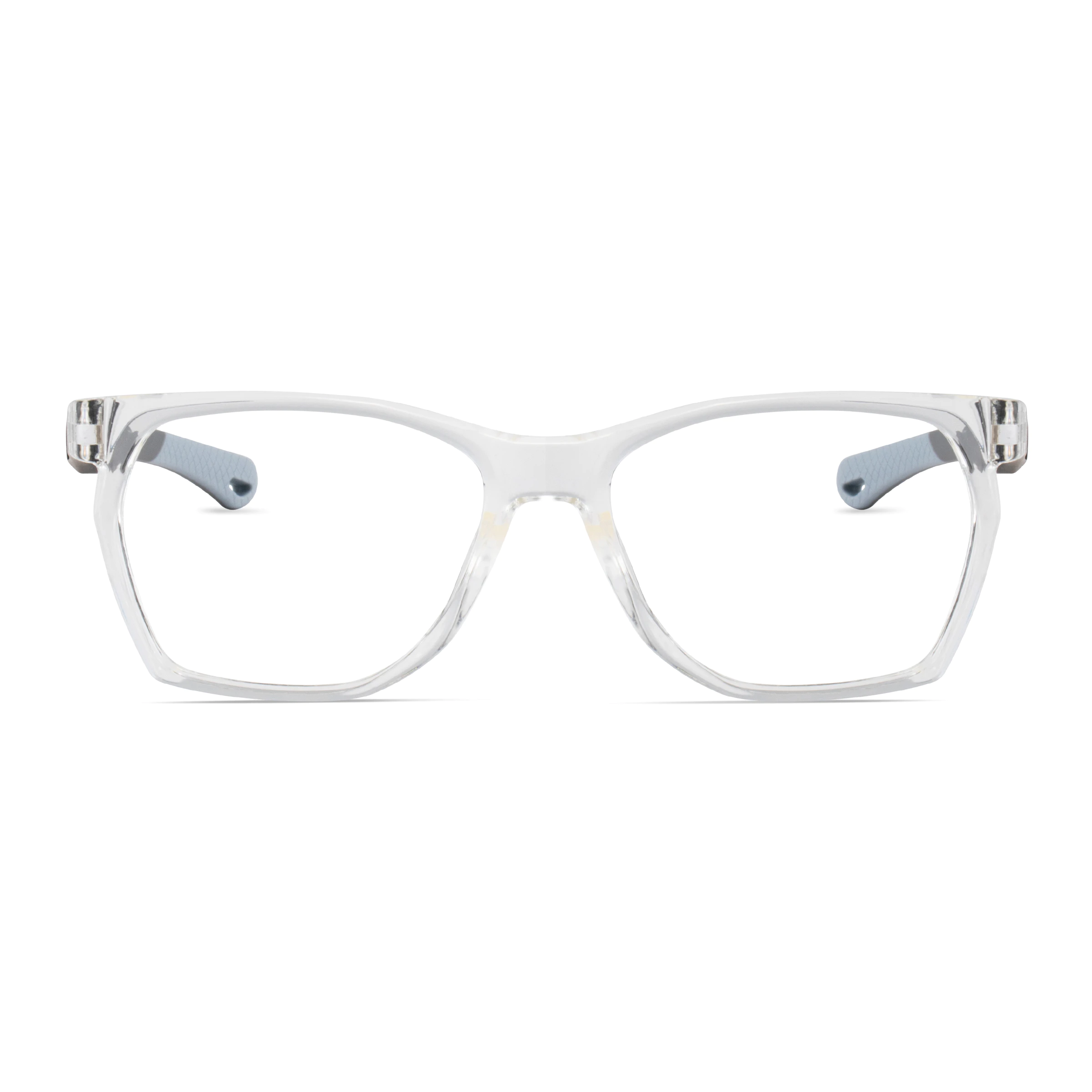 Transparent front with black and light-blue patterned temples, crafted from lightweight, elastic material. Designed for sports enthusiasts, it stays in place comfortably during running, cycling, or basketball, blending performance with style.