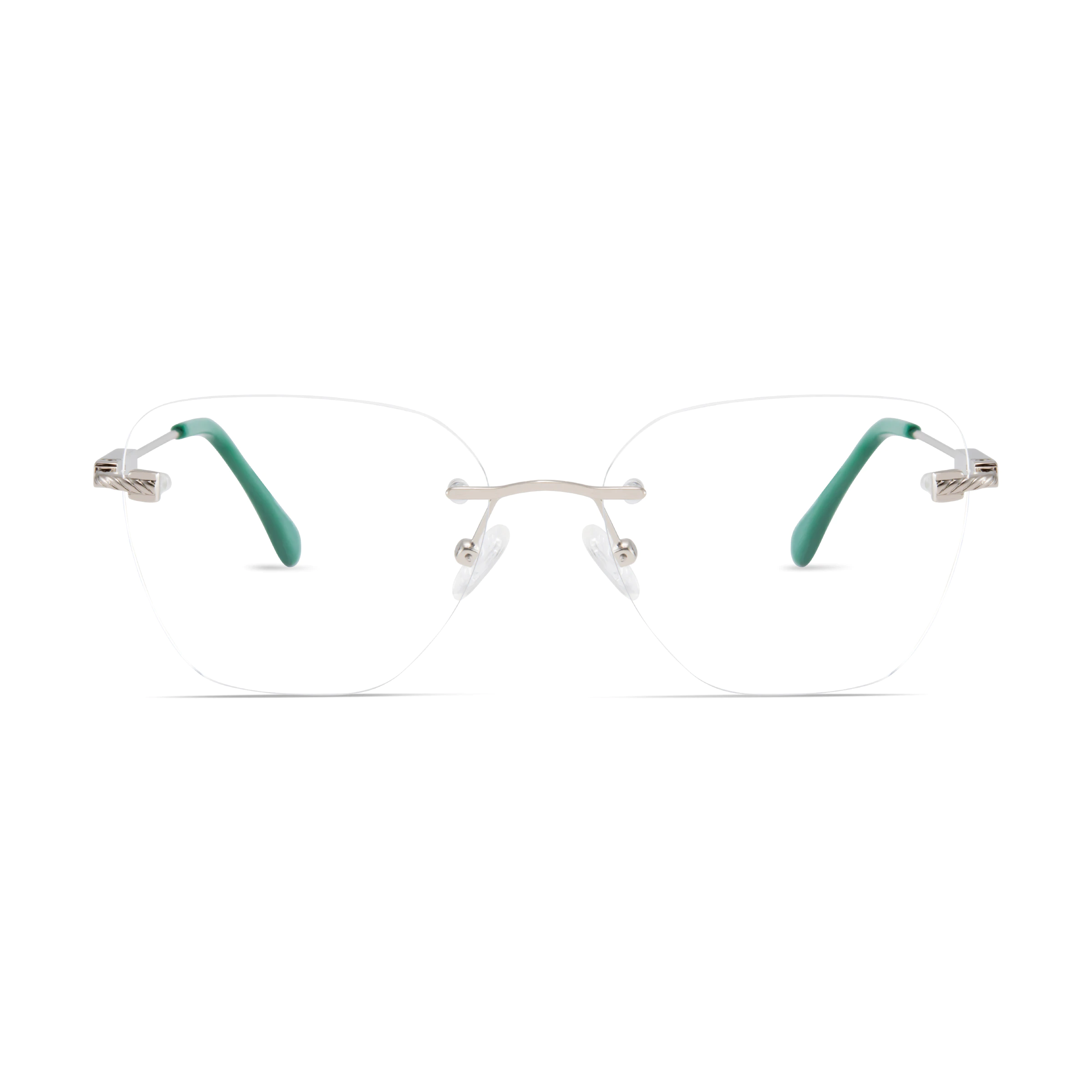 Modern rimless design accented by vivid green temple tips and subtle geometric patterning. Its minimalist artistic style suits individuals seeking unique, understated elegance for smart-casual and semi-formal occasions.