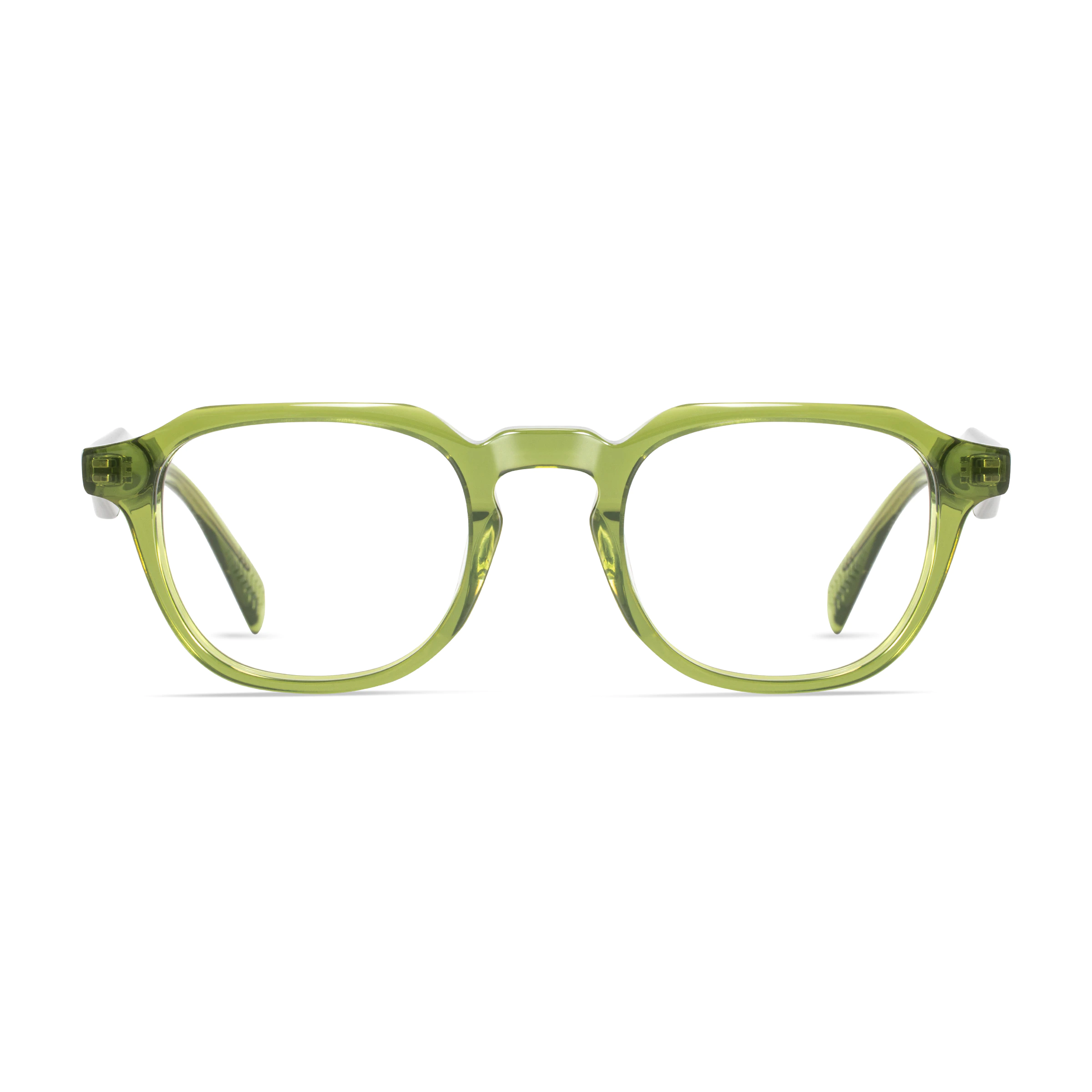 Rich transparent green acetate frames with subtly geometric lines for a modern twist. The distinctive color offers a sophisticated yet fresh look, perfect for creative workplaces or stylish urban activities.